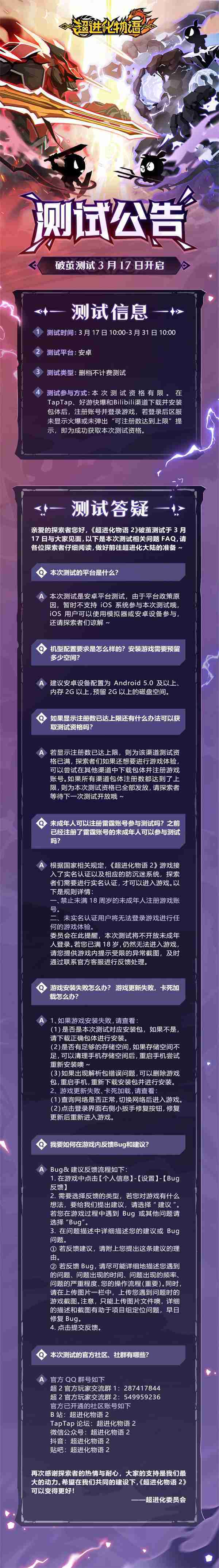 《超进化物语2》首次限号不计费删档测试——「破茧测试」将于3月17日开启,,,,随我们确认测试细节,,明天迈出踏上超进化大陆的第一步吧!!!