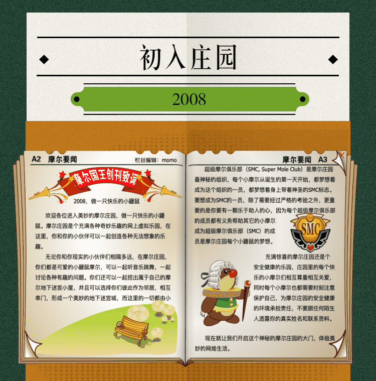 在这一年,,,,摩尔庄园诞生了。。。。在这里,,大家都是可爱的红鼻子鼹鼠小摩尔,,,,可以一起勤劳耕作,,一起高山滑雪......我们都是摩尔庄园的建设者。。。